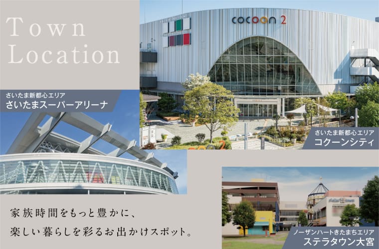 県内最大の街「大宮駅周辺」をはじめ、ショッピングモール「コクーンシティ」や「さいたまスーパーアリーナ」があるさいたま新都心エリア、「ステラタウン大宮」を中心に商業・芸術文化施設があるノーザンハートきたまちエリアも生活圏。都市の賑わいと緑ゆたかな潤いのある環境で新しい暮らし始めませんか。