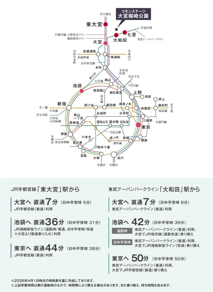 ![]() JR「東大宮」駅からは湘南新宿ラインと上野東京ラインの2路線で都心へダイレクトにアクセスします。東武「大和田」駅から3駅目の「大宮」駅乗り換えで都心の主要駅へスピードアクセス。「大宮」駅には6路線の新幹線が発着し、交通の要でリゾートエリアへ直結します。●JR宇都宮線「東大宮」駅(約1940m〜約2000m)●東武線「大和田」駅(約1120m〜約1190m)●東武線「七里」駅(約1480m〜約1550m) |