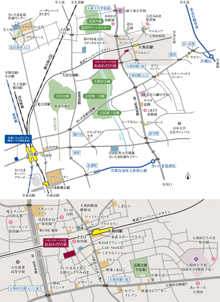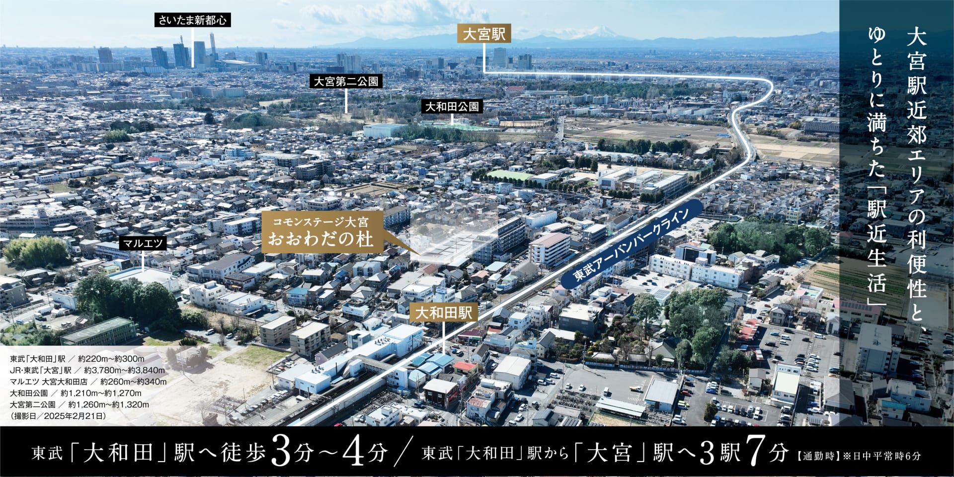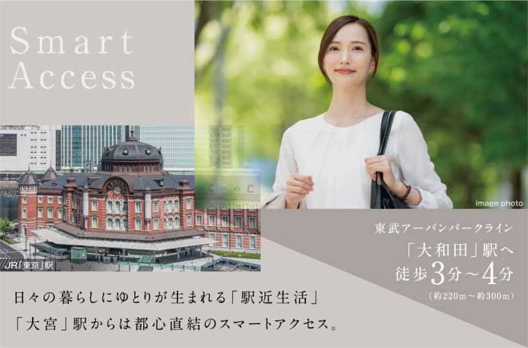 東武アーバンパークライン「大和田」駅へ徒歩3分〜4分の立地。3駅7分でビッグターミナル「大宮」駅へ。「大宮」駅からは新宿・渋谷方面・東京・品川方面へダイレクトアクセスできるので通勤や通学がスムーズです。