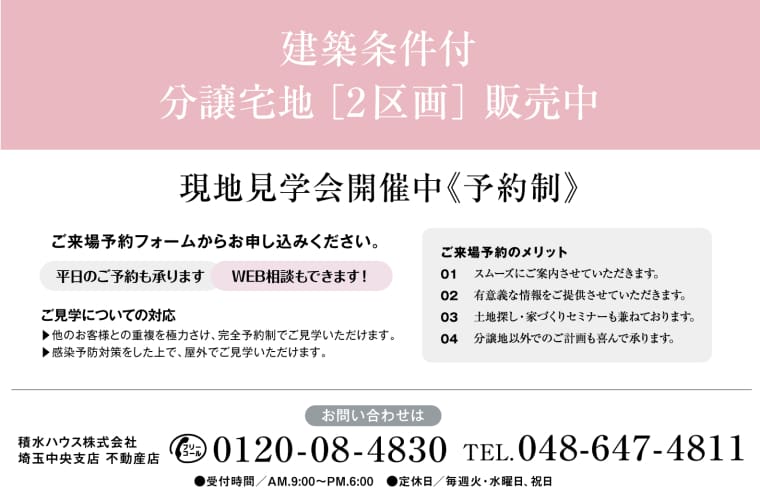 積水ハウス株式会社 埼玉中央支店定休日:火曜日、水曜日及び祝日 営業時間:9:00~18:00