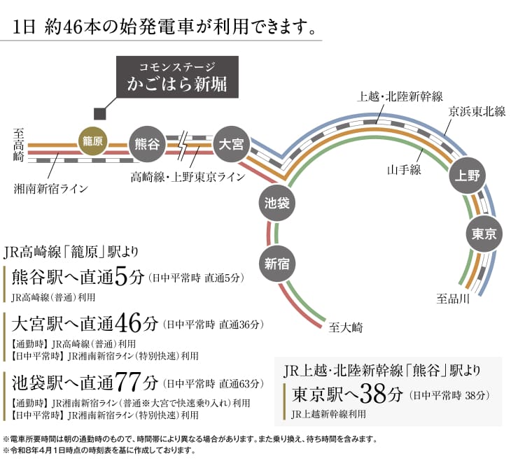 「籠原」駅が徒歩圏の利便性の高い立地。2路線を使い分けて新宿方面や東京方面へダイレクトにアクセスします。隣り駅は新幹線も停車する「熊谷」駅。「東京」駅へ38分のスピードアクセスするので通勤も可能なロケーションです。