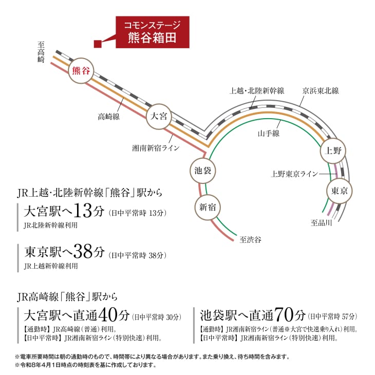 熊谷駅からは、JR上野東京ライン・湘南新宿ライン、新幹線で都心や郊外へスマートにアクセスします。