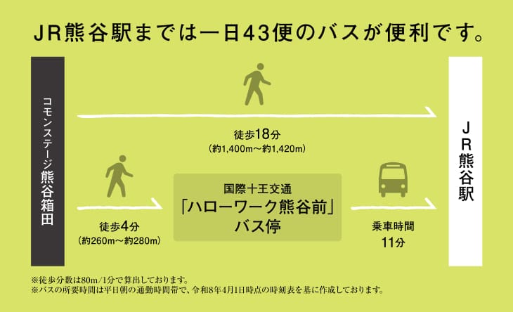 ![]() 「熊谷」駅へ徒歩圏のまち。「熊谷」駅へは1日43便のバスも利用できます。新幹線利用で「東京」駅へ38分のスピードアクセス。上野東京ラインや湘南新宿ラインで新宿方面と東京方面へ乗り換えなしでスマートアクセスします。 |