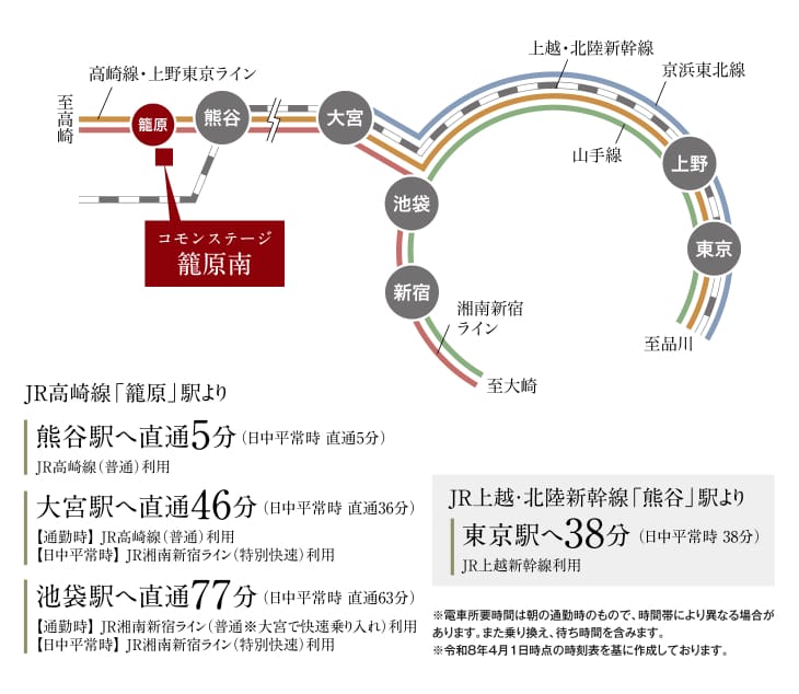 ![]() 駅近の利便を享受できるロケーション。1日46本の始発電車が利用できる「籠原」駅から、2路線で新宿・横浜方面と上野・東京方面へ直結します。隣駅の「熊谷」駅からは新幹線利用で都心やリゾート地へフットワークも軽やかに、行動範囲が広がります。 |