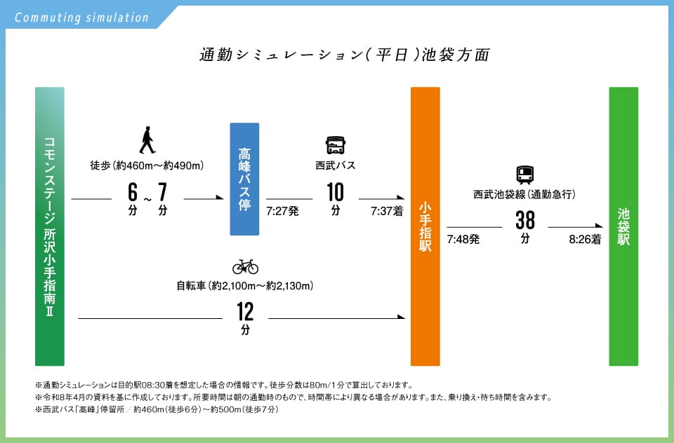 - 小手指駅からダイレクトに池袋駅へアクセスでき、通勤・通学に便利な立地。最寄りの高峰バス停から小手指駅へスムーズに移動できます。