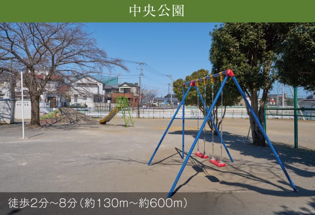 お子様がのびのびと走り回れる、広々とした公園。春には桜の木がきれいに咲きます。