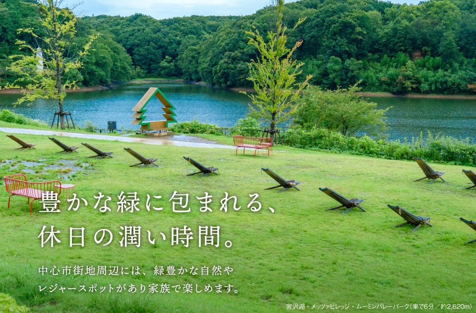 宮沢湖、メッツァビレッジやムーミンバレーパークへアクセスしやすい、豊かな自然が身近な環境。「水と緑のまち飯能」は、奥武蔵の豊かな自然につつまれた心ひろがる街。駅周辺の大型商業施設を始め、市街地には毎日の暮らしを支える利便施設が整っています。