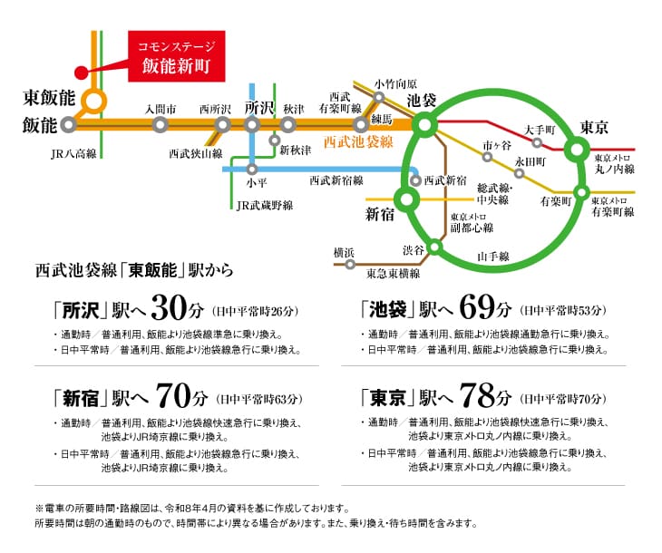 西武池袋線「飯能」駅へ徒歩14分(約1090m)、始発駅なので都心へのアクセスも快適で便利です。