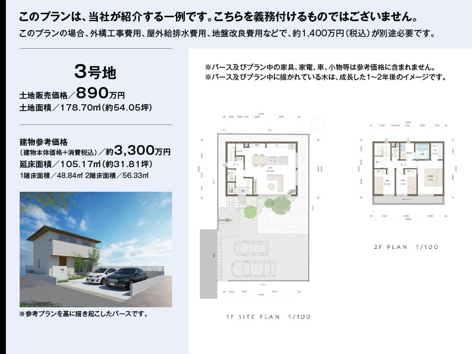 敷地面積/178.70 ㎡(約54.05坪)1F床面積/48.84㎡ 2F床面積/56.33㎡ 延床面積/105.17㎡(約31.81坪)
