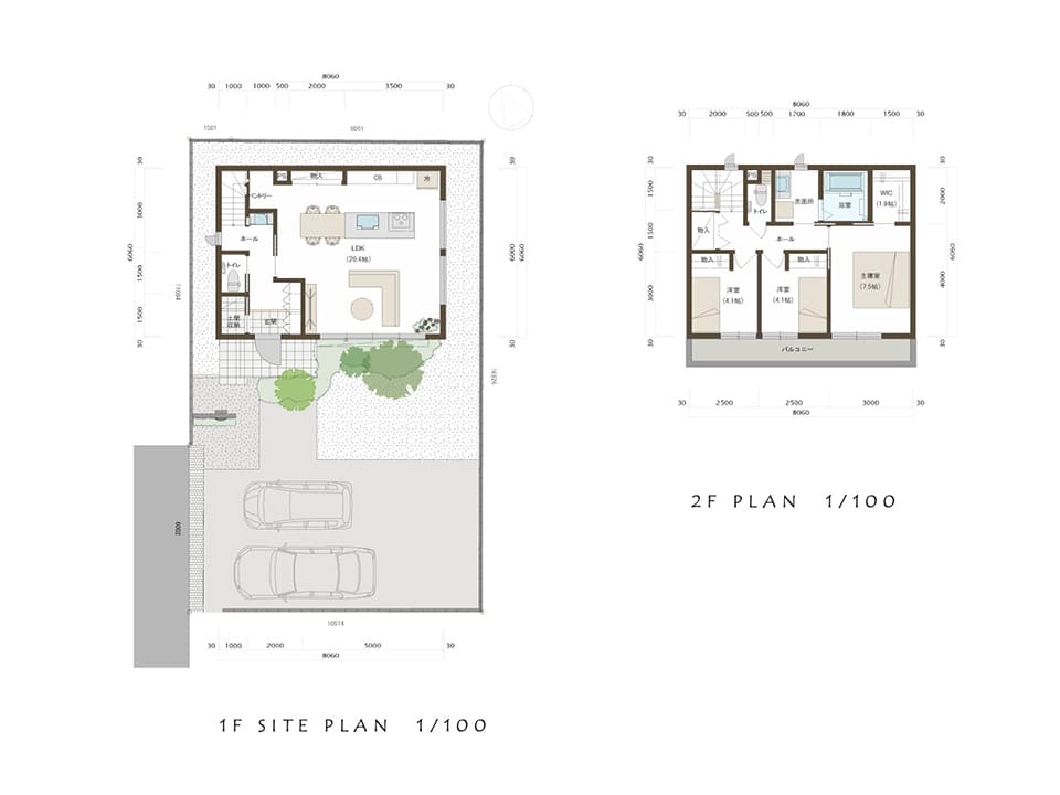 ※駐車スペースを2台分確保した参考プランですが、プランや車種により十分な駐車スペースの確保が難しい場合がございます。