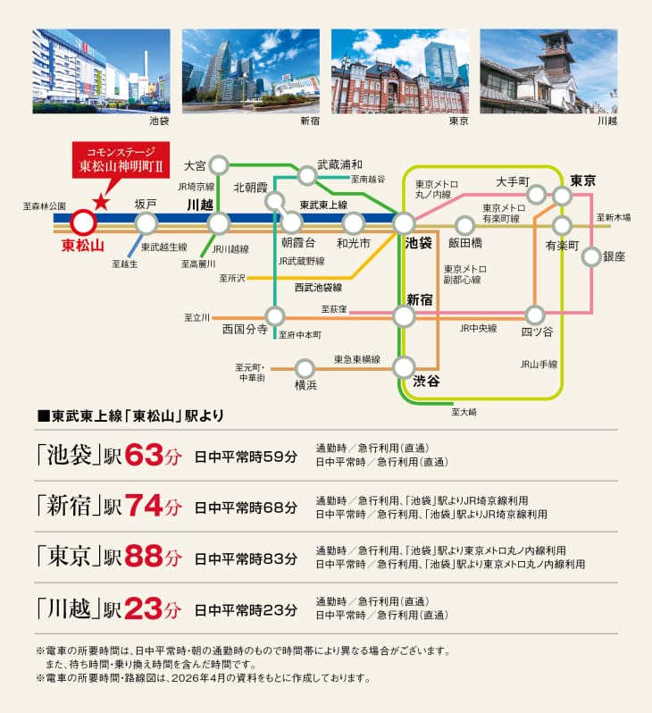 東武東上線「東松山」駅から「池袋」駅まで直通でアクセス。東武東上線利用で、都心まで快適アクセス。快速急行やTJライナーも停車。都内への通勤も快適です。副都心線や有楽町線への乗り入れもしています。