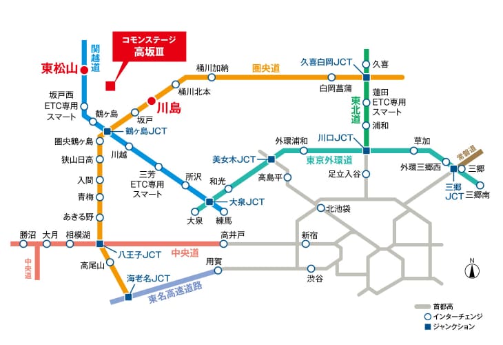 圏央道と関越道利用で、都心や郊外への車移動もスムーズです。