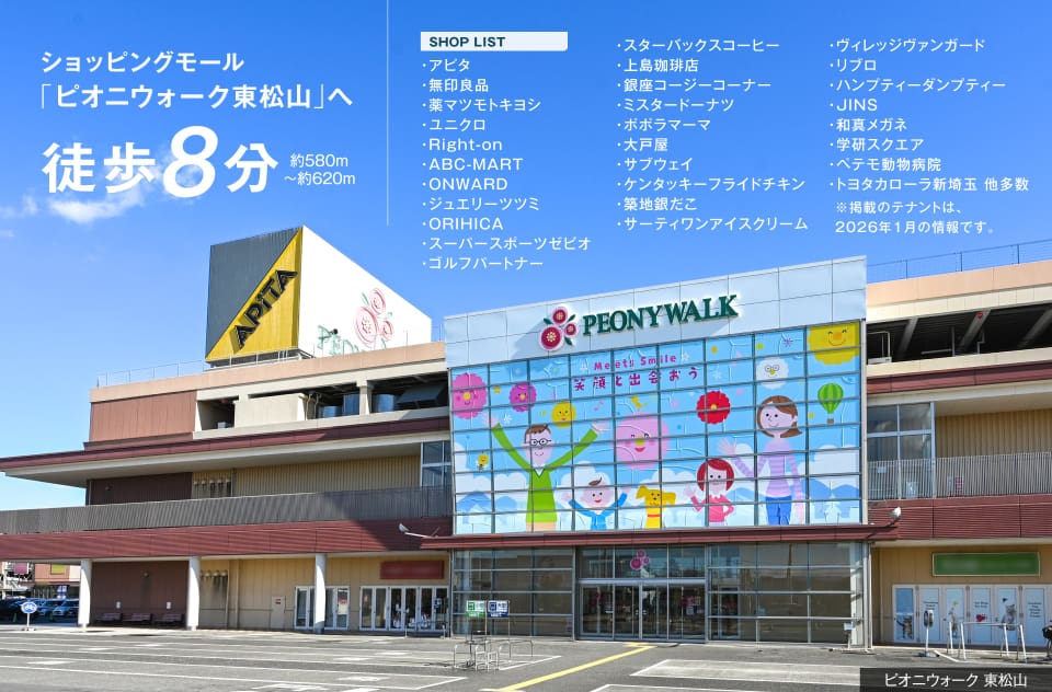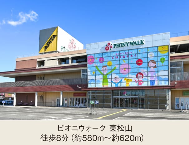 日常使いできるショッピングモール「ピオニウォーク東松山」をはじめ、スーパーやホームセンターなど多彩な商業施設整っています。保育・教育施設だけでなく、子育て支援センターも整った、緑豊かな公園が点在するロケーション。