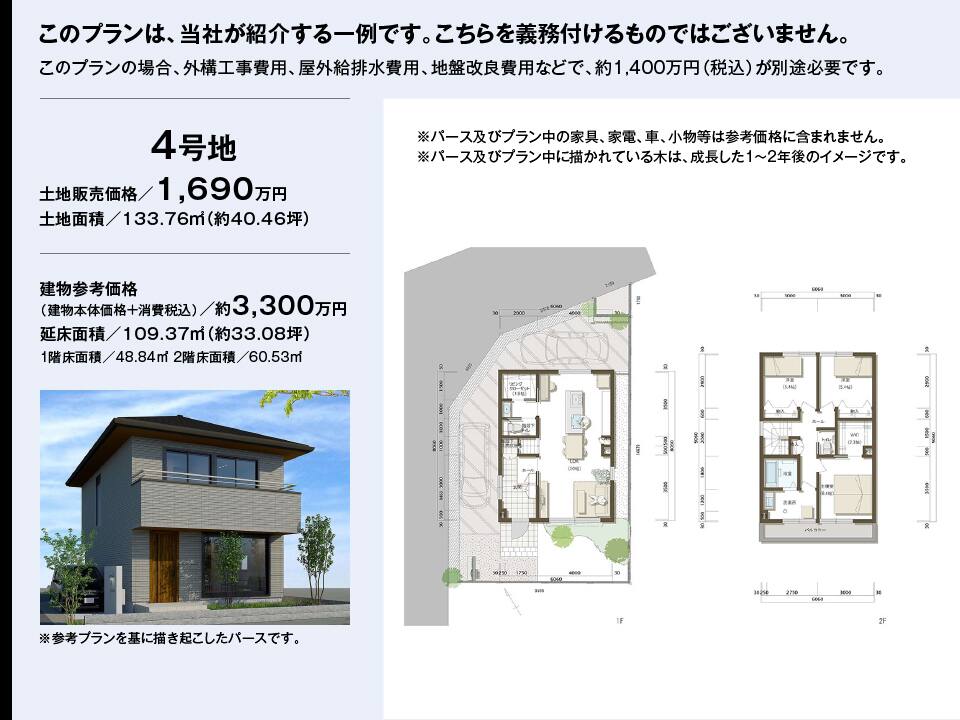 敷地面積/敷地面積/133.76 ㎡(約40.46坪)1F床面積/48.84㎡ 2F床面積/60.53㎡ 延床面積/109.37㎡(約33.08坪)