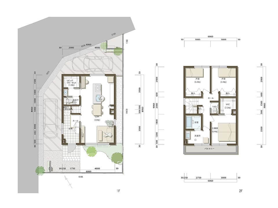 ※駐車スペースを2台分確保した参考プランですが、プランや車種により十分な駐車スペースの確保が難しい場合がございます。