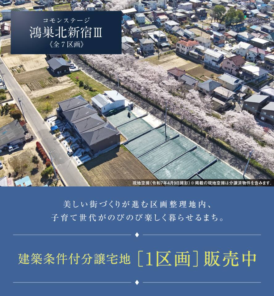 「北新宿第二土地区画整理事業」内に全7区画のまちが誕生。「なのはな保育園(徒歩7分/約500m)」やショッピングモール「ウニクス鴻巣(徒歩10分/約780m)」が徒歩圏なので子育て家族が安心して楽しく暮らせる環境です。