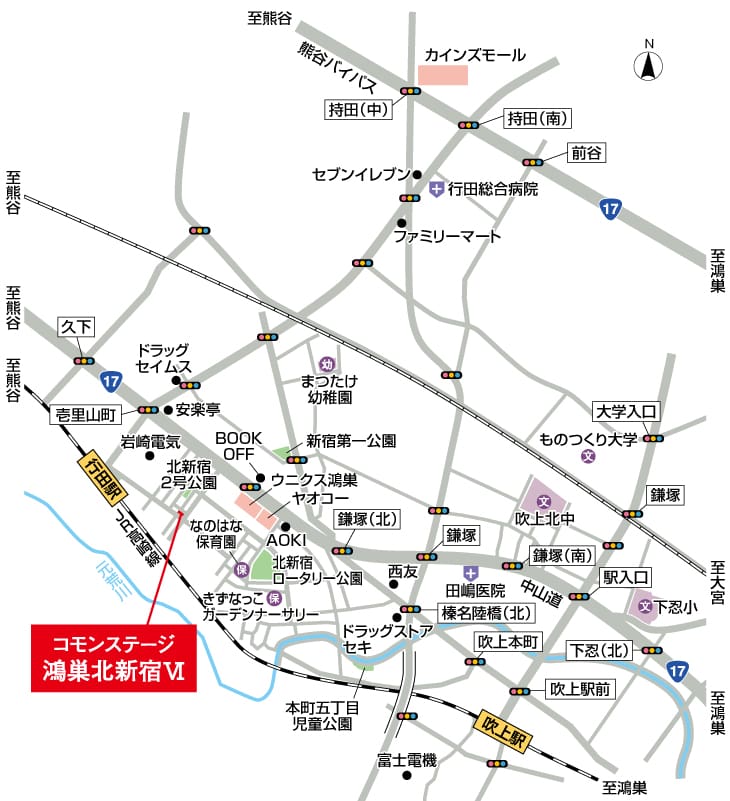 ショッピングモール「ウニクス鴻巣」へ徒歩6分(約480m)。幹線道路へのアクセスも良く、車での移動も快適です。