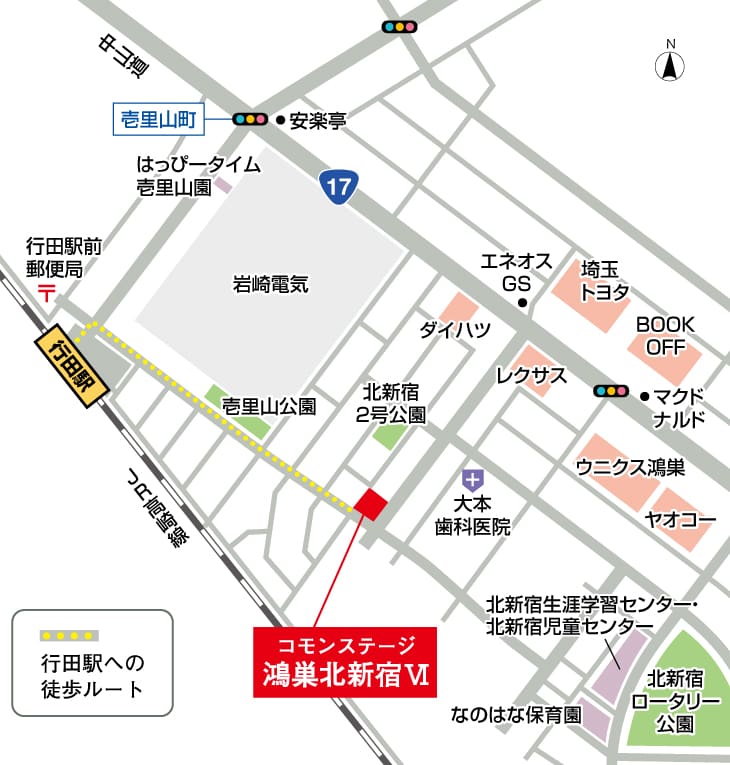 保育園、児童センター、公園やショッピングモールなどの生活利便施設が徒歩圏に整った快適なまちで暮らす「ゆとり生活」はじめませんか。●JR行田駅(徒歩6分/約460m)●なのはな保育園(徒歩6分/約440m)●北新宿生涯学習センター・北新宿児童センター(徒歩5分/約370m)●北新宿2号公園(徒歩2分/約150m)●ウニクス鴻巣(徒歩6分/約480m)