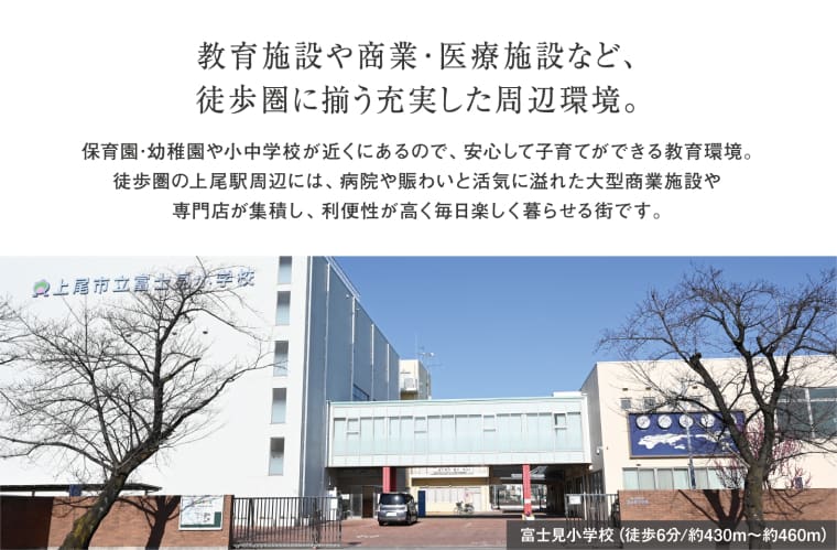 徒歩6分の「富士見小学校」を始め教育施設や公園が身近にあり、子育て世代が安心して暮らせるロケーション。