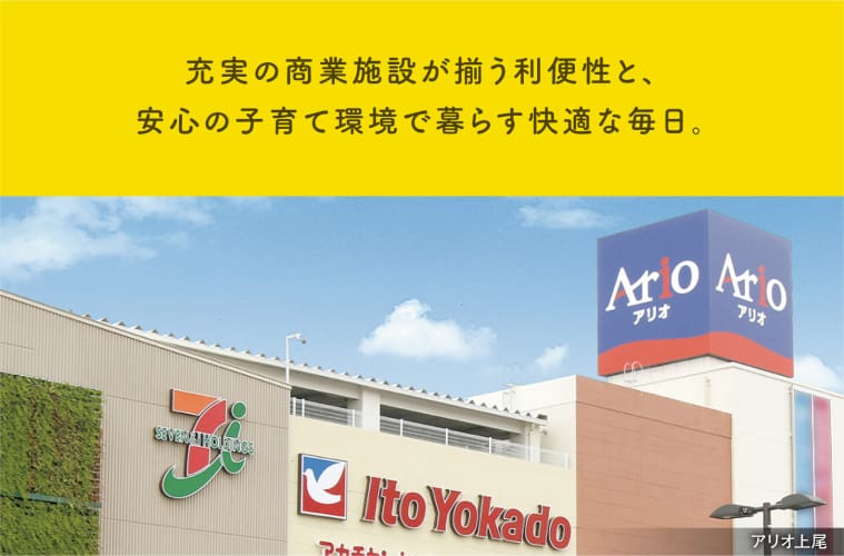 ![]() 教育施設や商業施設、医療施設などの暮らしに必要な機能が整った、子育てファミリーが安心して暮らせる街です。●アリオ上尾まで車で5分(約2,020m~約2,050m) |