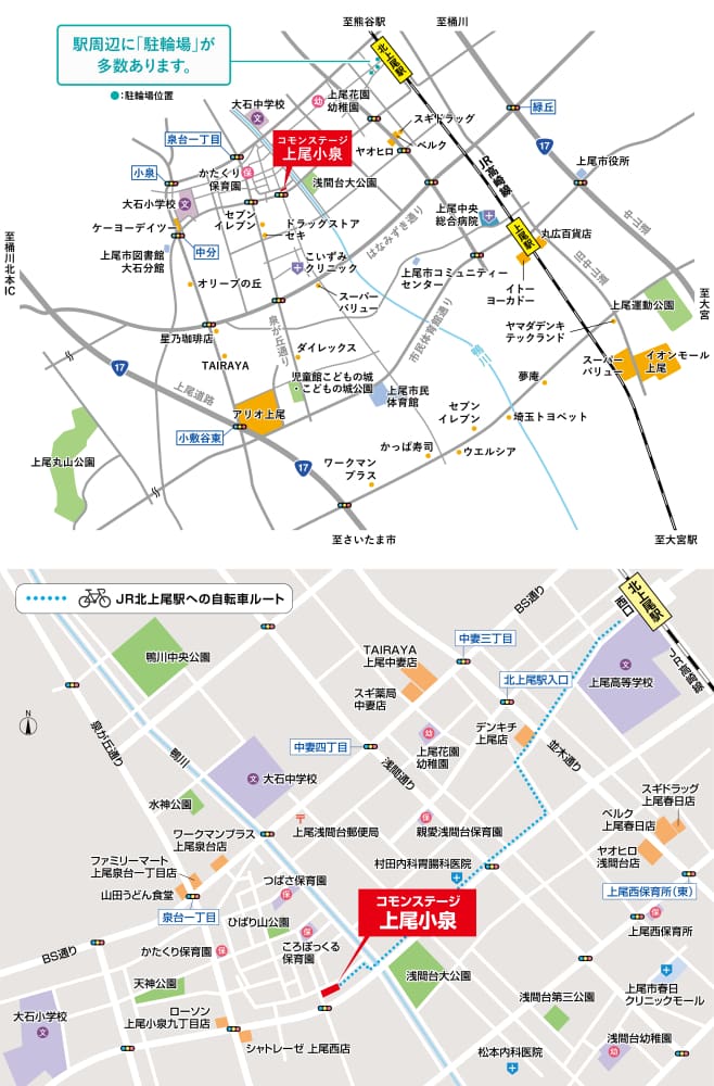 「北上尾」駅へ自転車で9分(約1,500~1,530m)。「上尾道路」や「国道17号線」の幹線道路で、車での移動もスムーズです。※自転車の所要時間は実走の場合です。