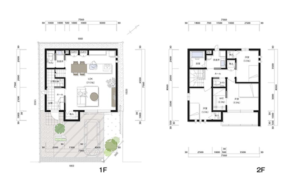■1F床面積/51.15㎡ 2F床面積/53.15㎡ 延床面積/104.30㎡(約31.55坪)