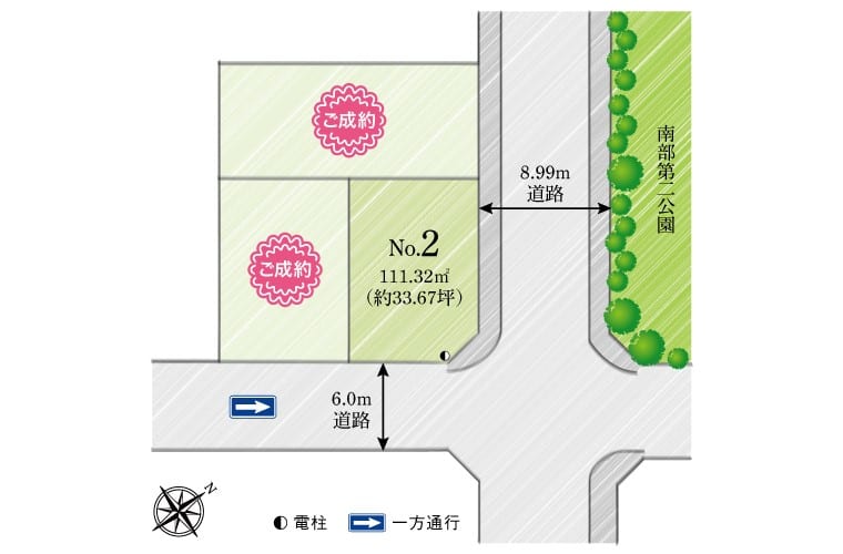6.0m以上の広い道路に面した、開放的な分譲地。