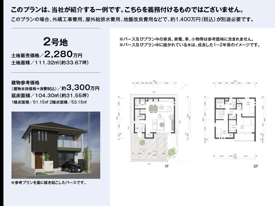 敷地面積/敷地面積/111.32 ㎡(約33.67坪)1F床面積/51.15㎡ 2F床面積/53.15㎡ 延床面積/104.30㎡(約31.55坪)