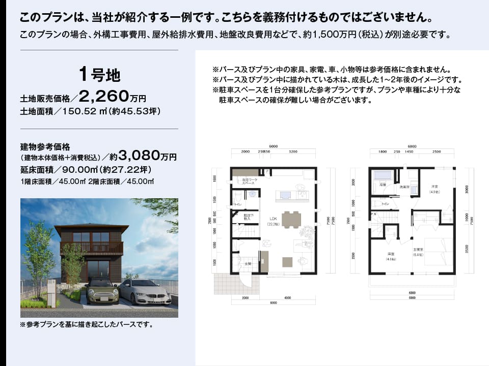 ※参考プランは、当社が紹介するプランの一例です。このプランを義務づけるものではありません。※プラン中の家具・家電・小物・車等は、建物参考価格には含まれておりません。※外観パースは参考プランを基に描き起こしたイメージパースです。※パース・外構図に描かれている樹木は、成長した1~2年後のイメージです。