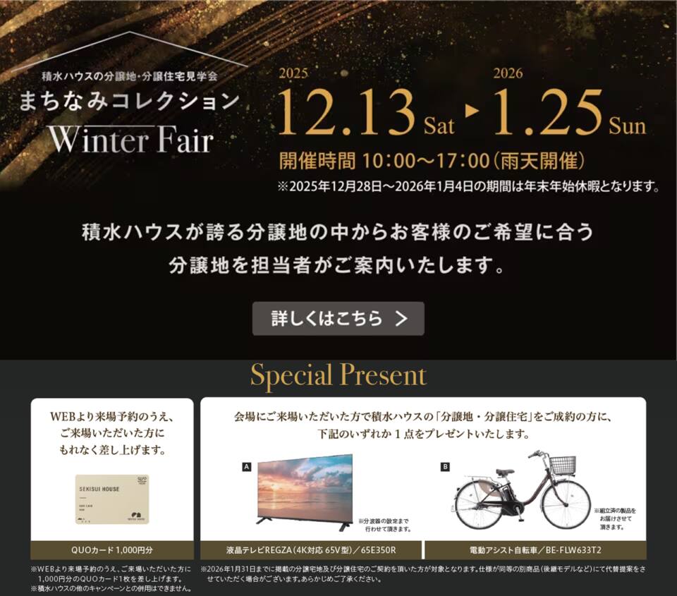 ●積水ハウス(株) 埼玉西支店:0120-458-420(営業時間/9:00~18:00 定休日/火・水曜日、祝日)
