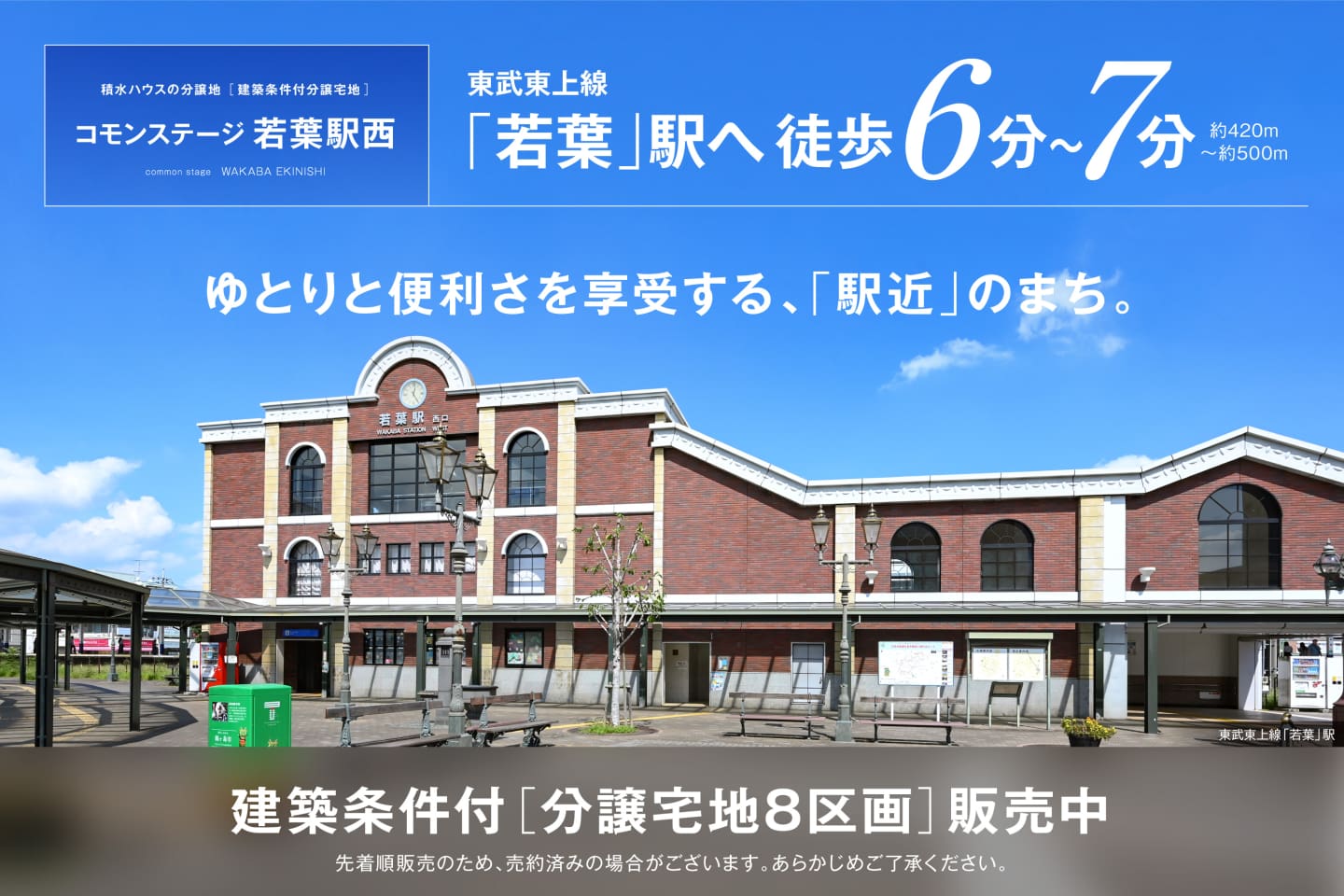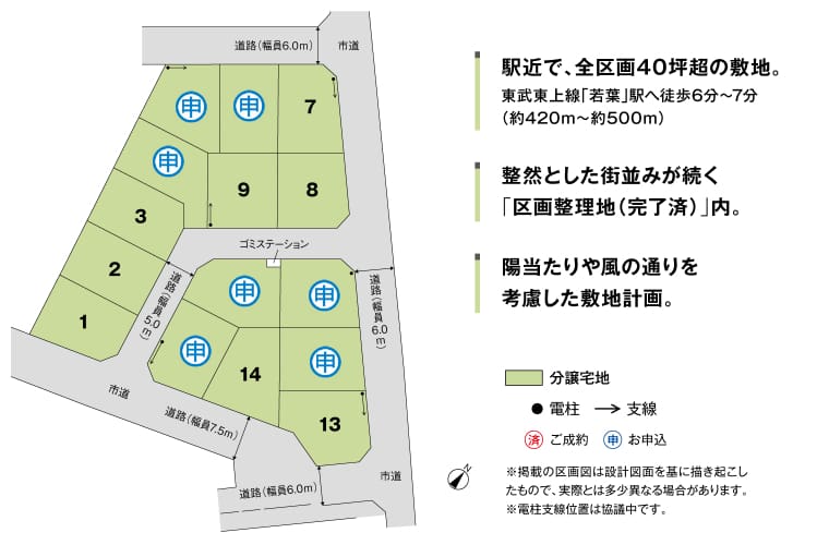 東武東上線「若葉」駅へ徒歩6分〜7分(約420m~約500m)、区画整理され整然とした街並みが続くエリア。
