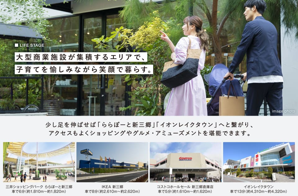 周辺のJR武蔵野線沿線には、ショッピングを楽しめる賑わいの大型商業施設が集積。未来に繋がる駅近の街で利便を享受する暮らしが始まります。