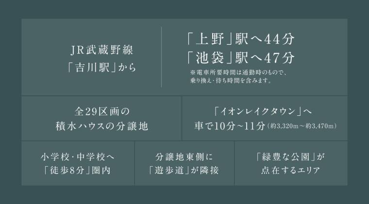 隣接エリアにある「イオンレイクタウン」や「ららぽーと新三郷」「コストコ新三郷」「IKEA新三郷」「イオンタウン吉川南店」など、大型商業施設へのアクセスが良い好立地の街です。