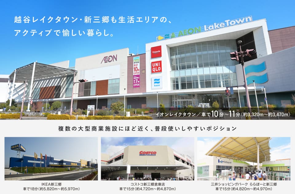 日常のお買い物には、近くのショッピングセンター「ウニクス吉川」やスーパー「コモディイイダ吉川店」が便利。休日のお出かけには「ららぽーと新三郷」や「イオンレイクタウン」がおすすめで、ショッピングはもちろんシネマ・グルメなど家族みんなで一日中楽しめます。