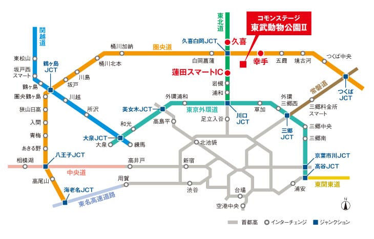 東北道「久喜IC(約8510m〜約8560m)」「蓮田スマートIC(約11030m〜約11080m)」や圏央道「幸手IC(約6610m〜約6660m)」の3つのICから都心や郊外へ、快適で自在なカーライフ。