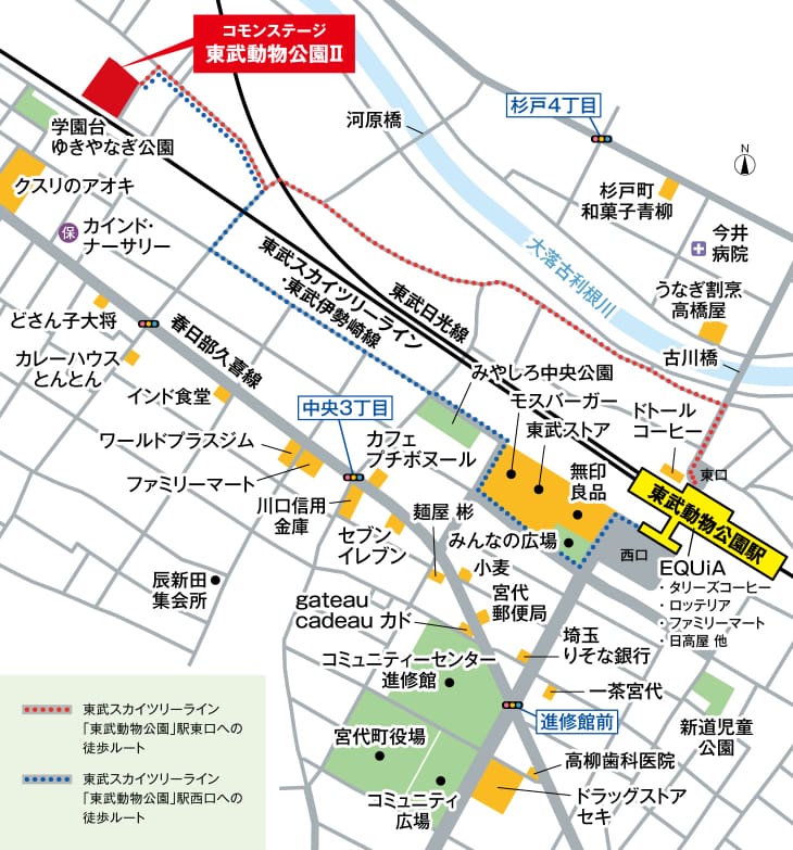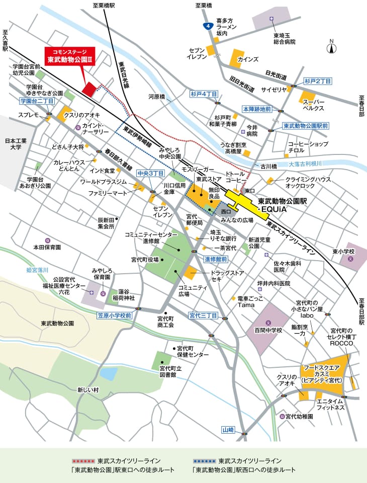 東武スカイツリーライン「東武動物公園」駅(東口)へ徒歩12分〜13分(約940m~約990m)。駅周辺には商業施設が集まっていて通勤途中のお買い物も便利です。