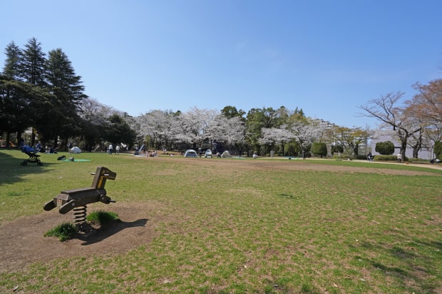 大型の木製アスレチック遊具が点在していますが、3歳児未満でもブランコやすべり台、馬のスプリング遊具を楽しめます。小学生以上のお子さんに人気のターザンロープも見逃せません。