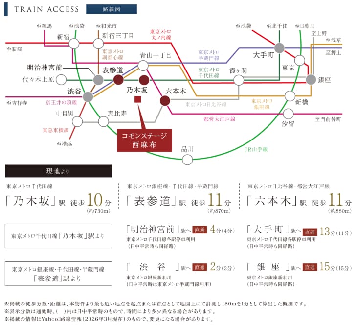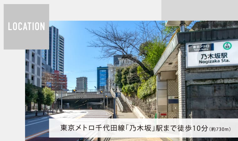 「乃木坂」駅まで徒歩10分。複数路線が利用できる、通勤に便利なロケーション。休日のお出かけも気軽に楽しむことができそうです。/2026年3月撮影