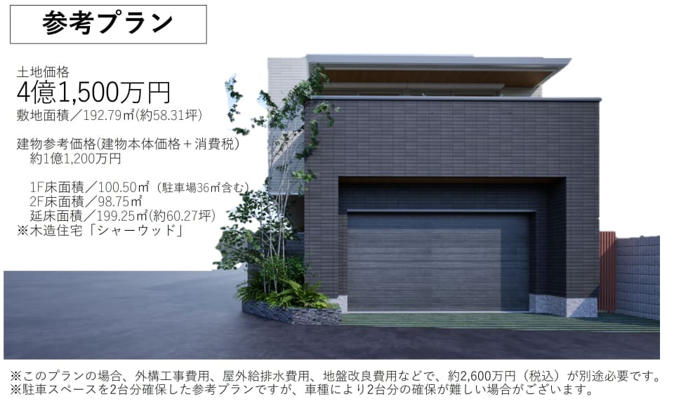 土地価格/4億1500万円、敷地面積/192.79㎡(約58.31坪)。床面積/1階100.50㎡・2階98.75㎡、延床面積/199.25㎡(約60.27坪)。