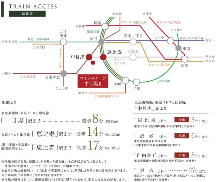 「中目黒」駅から「渋谷」駅へ直通6分、「東京」駅へは27分。