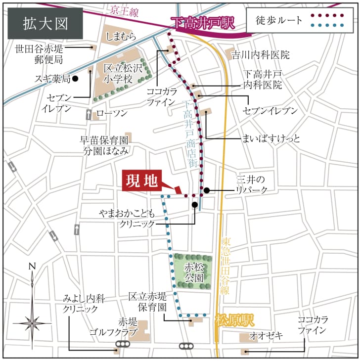 「下高井戸」駅まで徒歩6分。京王線と東急世田谷線の2路線が利用でき、ライフシーンに合わせた使い分けが可能です。