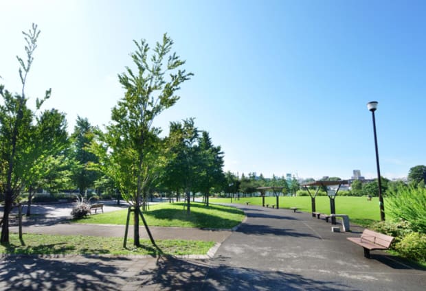 広々とした芝生広場のほか、ネット遊具や健康遊具などがあります。防災機能も備えた地域交流の拠点となり、多世代が憩うことができる公園です。