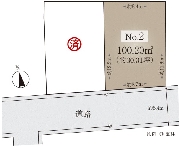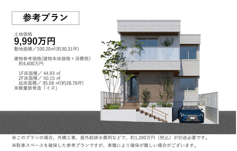 土地価格/9990万円、敷地面積/100.20㎡(約30.31坪)。1F床面積/ 44.93 ㎡・2F床面積/ 50.15 ㎡、延床面積/ 95.08 ㎡(約28.76坪)。