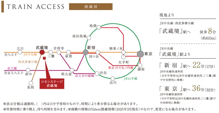「新宿」駅へ22分、「東京」駅へ36分と、都心へ快適にアクセスできます。