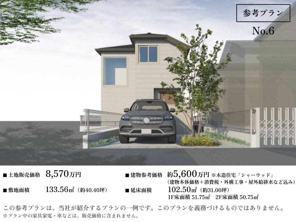 土地価格/8570万円、敷地面積/133.56㎡(約40.40坪)。床面積/1階51.75㎡・2階50.75㎡、延床面積/102.50㎡(約31.00坪)。