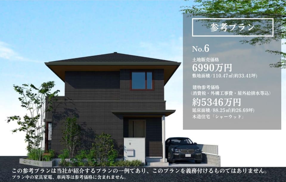 土地価格6990万円/建物参考価格約5346万円(消費税・外構工事費・屋外給排水等込)/敷地面積110.47㎡(約33.41坪)