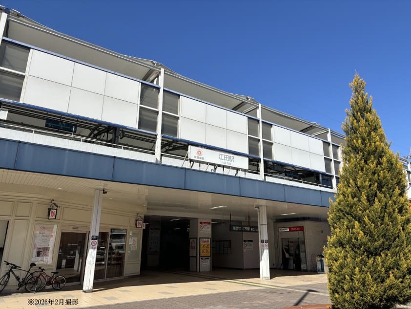 東急田園都市線「江田」駅まで徒歩12分。駅構内に100円ショップやコンビニ、洋菓子店、ベーカリーカフェなどがあり、駅利用時に気軽に立ち寄ることができます。