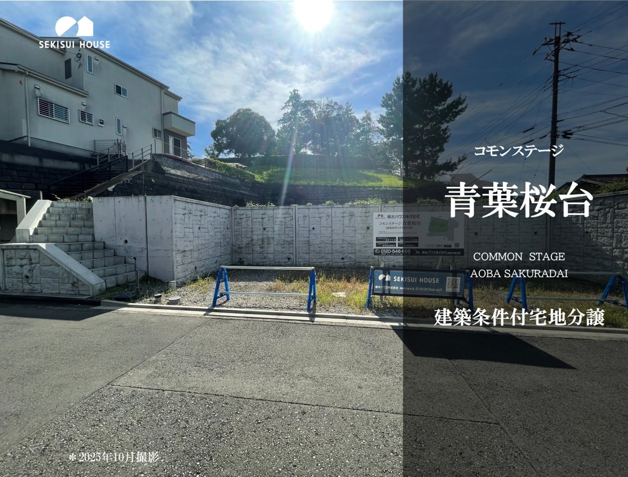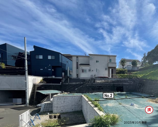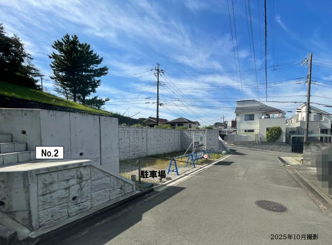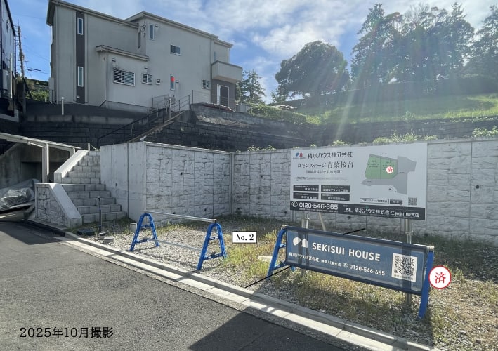 ![]() 現地は既に階段と擁壁を造成しています。前面道路と敷地に高低差があるため、周囲の視線が気になりにくく、プライバシーを守ります。/2025年10月撮影 |