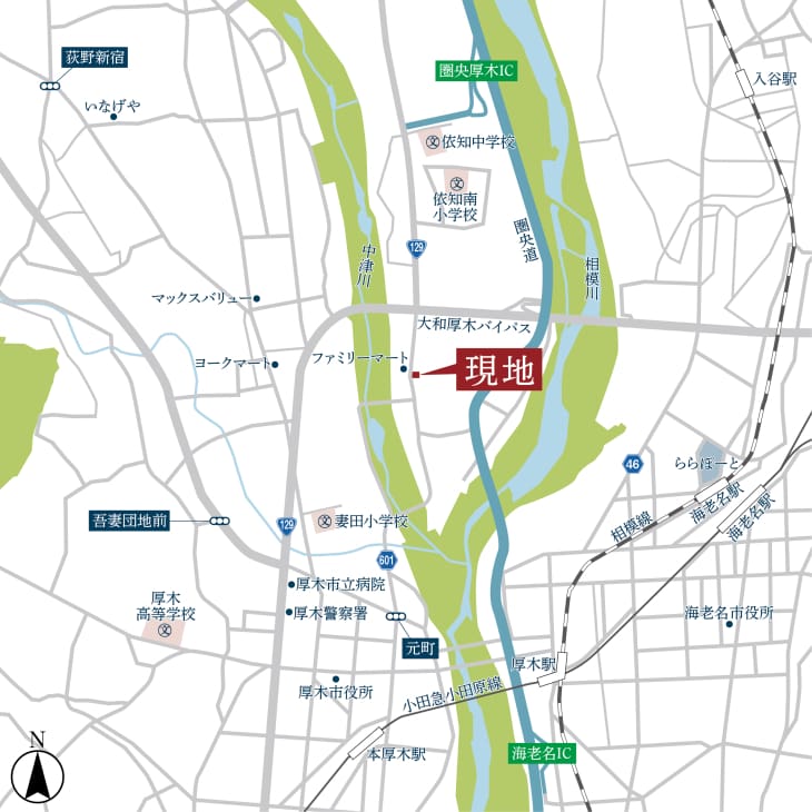 『コモンステージ厚木金田』は、小田急小田原線「本厚木」駅(約2,560~2,600m)が最寄りの分譲地で、通勤・通学・お出かけにも便利なロケーションです。