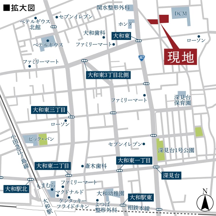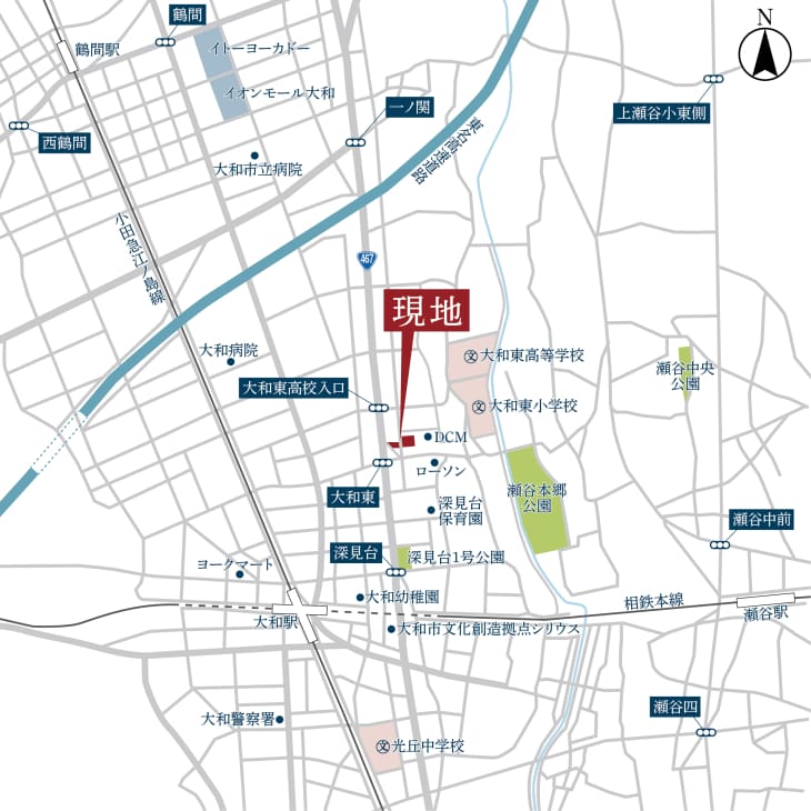 『コモンステージ大和深見東』は小田急江ノ島線・相鉄本線「大和」駅まで徒歩13分(約980~1,030m)の分譲地です。